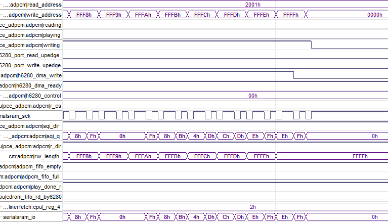 ADPCM 用 RAM address 0xffff の読み込みで正常なデータがでていないことを確認. 読み込み処理には問題がなく、書き込み処理に問題があった. いままで結構な数の ADPCM 用 RAM への DMA 転送で最後の 4bits が正常に転送されていなかったので結構深刻なバグだった. |